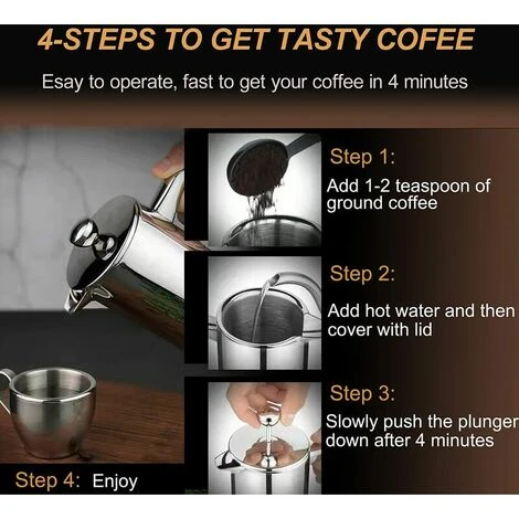 4 tapes pour prparer un dlicieux caf Ajoutez 1,8 oz/50 g de caf moulu dans la cafetire, puis versez-y de l’eau chaude(environ 95 / 203 ). Ensuite, remettez le piston dans la presse sans l’enfoncer et laissez le caf infuser pendant 4 minutes. Enfin, poussez