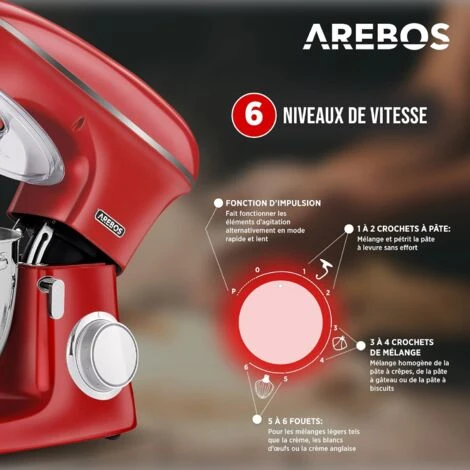 【Conception antidérapante rapide et pratique】Le mixeur AREBOS comprend plusieurs accessoires : fouet, crochet pétrisseur et batteur. La lumière LED bleue intégrée indique les 6 réglages de vitesse différents, comme pour fouetter les œufs, pétrir la pâte et bien d’autres fonctions. 5 pieds antidérapants assurent une assise silencieuse et sûre pendant le fonctionnement.