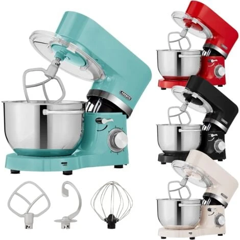 - Contenu de la livraison : 1x robot de cuisine ; 1x fouet ; 1x batteur ; 1x crochet pétrisseur ; 1x dispositif antiprojections ; 2x bol en acier inoxydable ; 1x manuel d’utilisation