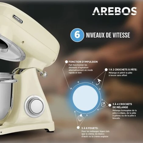 【Conception antidérapante rapide et pratique】Le mixeur AREBOS comprend plusieurs accessoires : fouet, crochet pétrisseur et batteur. La lumière LED bleue intégrée indique les 6 réglages de vitesse différents, comme pour fouetter les œufs, pétrir la pâte et bien d’autres fonctions. 4 pieds antidérapants assurent une assise silencieuse et sûre pendant le fonctionnement.