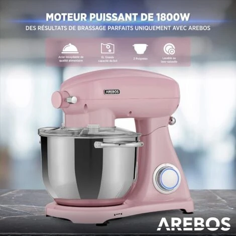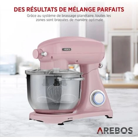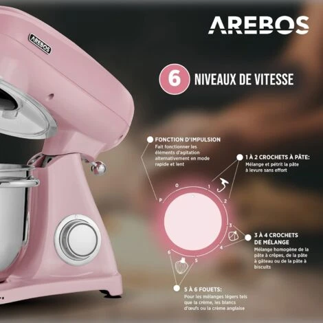 【Conception antidérapante rapide et pratique】Le mixeur AREBOS comprend plusieurs accessoires : fouet, crochet pétrisseur et batteur. La lumière LED bleue intégrée indique les 6 réglages de vitesse différents, comme pour fouetter les œufs, pétrir la pâte et bien d’autres fonctions. 4 pieds antidérapants assurent une assise silencieuse et sûre pendant le fonctionnement.