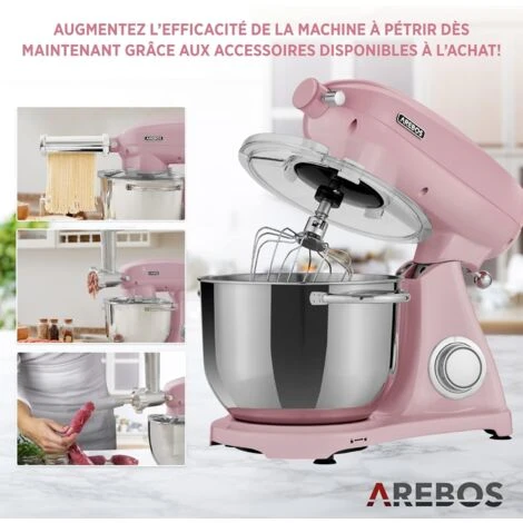 【Conception de la tête inclinable】Le mécanisme de déverrouillage peut être replié et permet une manipulation facile des accessoires et du bol. Fixez ou détachez des accessoires en quelques étapes simples. Pour plus d’efficacité de l’appareil, nous proposons une variété d’accessoires pour étendre encore la polyvalence de cet outil : accessoires pour la préparation de pâtes, set pour la confection de saucisses et accessoire pour hachoir à viande. (Remarque : les accessoires doivent être achetés séparément.)