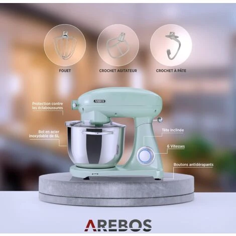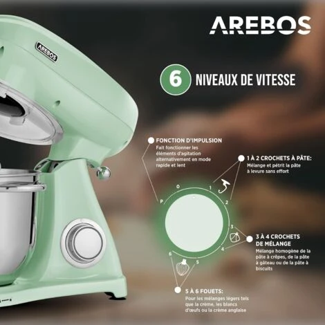 【Conception antidérapante rapide et pratique】Le mixeur AREBOS comprend plusieurs accessoires : fouet, crochet pétrisseur et batteur. La lumière LED bleue intégrée indique les 6 réglages de vitesse différents, comme pour fouetter les œufs, pétrir la pâte et bien d’autres fonctions. 4 pieds antidérapants assurent une assise silencieuse et sûre pendant le fonctionnement.