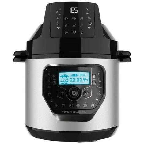 Autocuiseur programmable avec 6 L de capacité, friteuse, application mobile et balance. Robot de cuisine multifonctions qui cuisine pour vous tout type d’élaboration en un temps record. 27 manières différentes de cuisiner qui vous aideront à préparer des entrées, du riz, des pâtes, des ragoûts, des estouffades, des poissons, des desserts, … et toutes les recettes que vous imaginez. L’ensemble de la friteuse à air chaud vous permettra de faire frire vos aliments d’une façon très saine. Il incorpore une balance pour peser avec une grande précision les aliments que vous introduisez dans la cuve afin de travailler avec des quantités exactes et d’obtenir des résultats excellents. Innovant couvercle Advance qui libère la pression plus facilement, en évitant les éclaboussures. Grâce à son couvercle rabattable, vous pourrez remuer et servir en évitant les taches. Il possède une cuve Excelsior extrêmement antiadhésive qui permet d’obtenir des résultats optimaux pour toutes vos recettes. Programmable 24 h pour que vous profitiez d’un repas chaud lorsque vous arrivez chez vous. Profitez des repas en famille grâce à sa grande capacité de 6 litres. Mode Eco pour économiser jusqu’à 50 % d’énergie pendant que vous cuisinez. Modes de cuisson : turbo, à pression, à la vapeur, ragoût, feu lent, pocher, confire, fermenter, pain, dessert, riz, pâtes, plancha, faire revenir, faire frire et four. Système intelligent GMCore qui adapte le temps d’élaboration en fonction de la quantité d’aliments. Inclus : un livre de recettes complet et un accès aux réseaux sociaux interactifs mais aussi à toutes les nouvelles recettes hebdomadaires de Cecotec. 11 températures ajustables jusqu’à 200 ºC pour élaborer tout type de recettes. 5 pression ajustables jusqu’à 90 kPa pour cuisiner plus rapidement. Écran LCD avec panneau de contrôle très ergonomique qui permet une visualisation complète du processus de cuisson. Il possède les options de Chauffer et de Réchauffer pour s’adapter à tous les besoins de l’utilisateur. Contrôle guidé pas à pas par voix en 6 langues : espagnol, anglais, portugais, français, italien et allemand. Mémoire Eprom qui se souvient de la programmation en cas de coupure de courant. 14 systèmes de sécurité qui assurent le correct fonctionnement de l’autocuiseur avec des pressions élevées sans aucun danger. Autocuiseur GM modèle H Deluxe Fry Cuve Daikin ovale antiadhésive Gobelet doseur Louche Plateau four Panier de friture Manuel Livre de recettes-Guide d’apprentissage