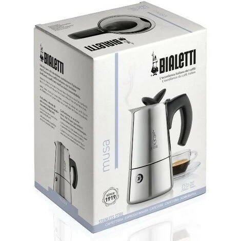 Cafetière Musa induction 4 tasses inox de la marque BIALETTI. Pour 4 tasses. Matière : Inox. Poignée et pommeau en bakélite. Soupape de sécurité exclusive brevetée Bialetti. Tous feux dont induction. Compatible lave vaisselle. Couleur : Noir, Acier inoxydable.