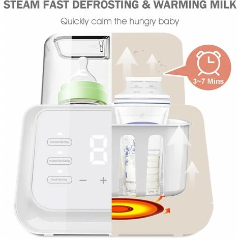 【Fonction de dégivrage rapide & Fonction de réchauffement : 30 ml d’eau génère suffisamment de vapeur pour décongeler ou réchauffer le lait entre 3 et 7 minutes, ce qui calme rapidement votre bébé qui pleure. La conception lucarne pour différentes formes de biberons.