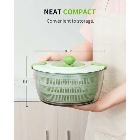 1. [Essoreuse à salade multifonction] L’essoreuse à salade permet de laver les légumes, elle est également conçue pour sécher votre salade en quelques secondes. Le panier amovible peut être utilisé comme strianer. Et le bol transparent est parfait lorsqu’il est doublé comme bol de service pour les herbes ou les baies. Grande capacité de 3,8 QT (3 à 4 portions) suffisante pour un usage familial. 2. [Conçu pour votre commodité] Sa poignée rotative à manivelle est confortable à saisir, ce qui facilite la rotation du panier à pleine vitesse en quelques tours seulement. Son système de drainage intégré vous permet de verser de l’eau sans retirer le couvercle. La salade peut être servie directement à l’aide du bol transparent. Pour nettoyer cette essoreuse à salade : essorez dans chaque sens, videz, rincez et séchez à la main. 3. [Facile à utiliser et à ranger] Design créatif rendant l’essoreuse à salade intéressante. Faites tourner la poignée pour laver ou sécher les légumes. Facile à utiliser, même les enfants peuvent égoutter les légumes par eux-mêmes. Ses parties amovibles facilitent le nettoyage et le rangement. Vous pouvez simplement retirer le couvercle du bol de la passoire ou servir directement la salade dans le bol transparent. 4. [Matériau sans BPA] Notre essoreuse à salade est fabriquée en matière plastique de qualité supérieure sans BPA, absolument sans danger pour la préparation de salades ou le service de nourriture, fiable et durable.