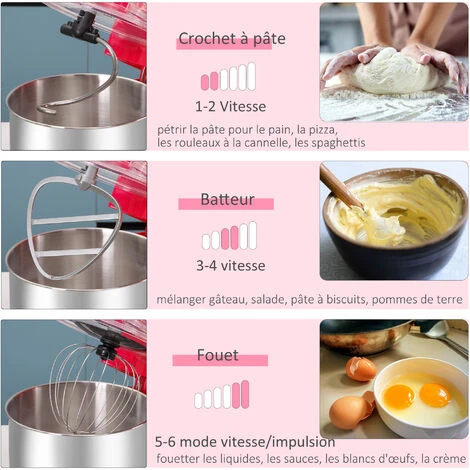 – Batteur et crochet pétrisseur pour répondre à tous vos besoins de préparation (pâtes à pain, brioche, soufflé, monter les blancs et même émulsionner mayonnaises et vinaigrettes)
