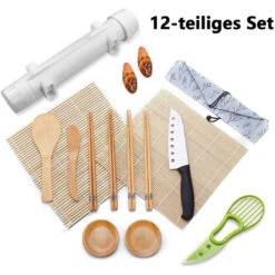 Kit De Fabrication De Sushis 12 Pièces, Machine à Sushi Bazooka Tout-en-un Avec Rideau à Sushi, Moule à Sushi, Couteau à Sushi, Couteau à Beurre, Baguettes, Repose-baguettes, Cuillère, Couteau En Bamb