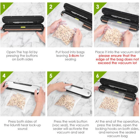 1.Mettez le sac d’étanchéité dans la bande d’étanchéité, vous devez laisser un espace de 5 cm entre l’aliment et le haut du sac. Puis appuyez sur les deux côtés de l’appareil pour verrouiller le couvercle.