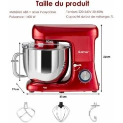 Robot Pâtissier 1400 Watts 6 Vitesses 7 Litres Avec Crochet à Pâte Et Fouet à Fils Rouge