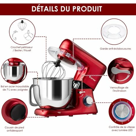 3 accessoires, le crochet à pâte, le batteur et le fouet à fils