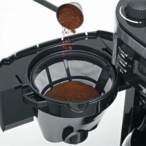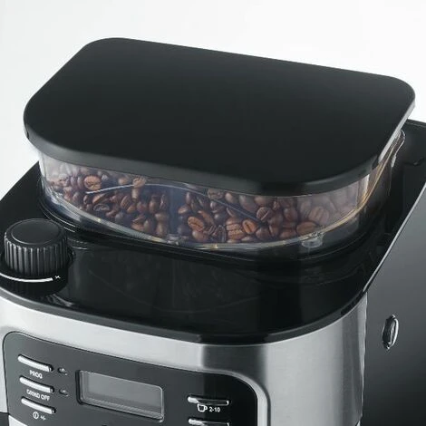 Réservoir d’eau : 1.2 L. Arrêt automatique. Maintien au chaud 35 minutes. Porte-filtre pivotant et amovible avec fonction stop-goutte. Filtre permanent supplémentaire. Grand réservoir à grains d’une capacité de 200 g. Niveau d’eau visible. Coloris : Inox brossé et Noir. Puissance : 1000 W. Capacité pour 10 grandes ou 15 petites tasses. Plaque chauffante. Poids net : 4.4 kg. Poids brut : 6 kg. Dimensions (L x P x H) : 22,5 x 26 x 43,5 cm.