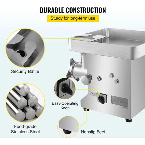 Ce hachoir a viande electronique est un choix ideal en tant que processeur de viande (viande de cerf, poulet, porc, etc.), cest un excellent hachoir a viande et fabricant de saucisses. L’ensemble du corps est entierement en acier inoxydable. Il adopte 850 W avec une vitesse de rotation de 170 tr/min et 550 lbs/h (250 kg/h) sortir. Il est parfait pour le broyage des aliments dans les restaurants, les supermarches, les fast-foods, les boucheries, etc.