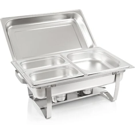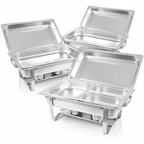Le set se compose de trois récipients d’eau chaude remplis de deux récipients GN 1/1, un récipient GN 1/2 et deux récipients GN 1/4. En plus des couvercles, six récipients de pâte combustible sont également inclus dans la livraison.